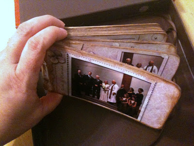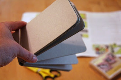 The book I purchased came already bound. Having not made any chipboard books before, I did not know what I was getting into. I have learned that it is much harder to make an already bound book than one linked together with chains or rings. Each two-page has to be laid open and allowed to dry for each step, as compared to unbound pages that can be laid out for drying all on one side, then all on the second side. Therefore, it takes much longer to make the bound books. See this post for my instructions. While making this book, I learned the importance of sanding! When you cut the pages directly after gluing down, the paper edges are rough. Sanding the edges down is an important step to sand away where your cutting is slightly uneven, making a smooth surface.