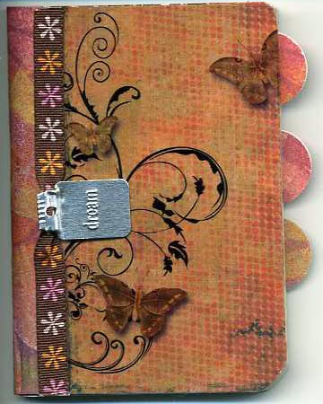 I will share how I did it. First I used PSE to arrange the swirls and butterflies, then I printed that out on a transparency. I printed out a background paper from the same kit on photo quality inkjet paper (matte). I cut the paper and transparency to fit my notebook. I measured and cut paper for the spine and attached that first, then attached the background paper, then the transparency on top of that. (I actually used my zyron to attach adhesive to each piece, not glue). I added the ribbon with the tag on it on top of everything. I used a circle punch to cut circles from paper to use as the tabs on the side. Now the reason I printed the butterflies and swirls on the transparency instead of just on top of the background paper was because I wanted it to be sturdy and hold up under handling, and plus it protects the paper underneath. I had to do the paper separate because if I put that on the transparency also, you would have seen the ugly black from the notebook under it.