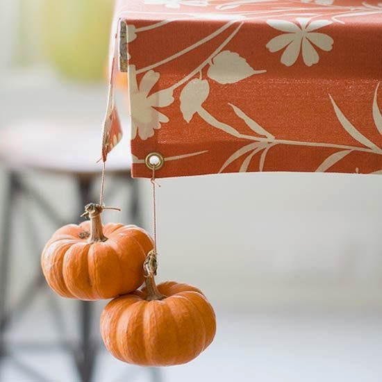 Every time I see these mini pumpkins in the store, I love them, but when I get them home, I do not know what to do with them. Generally, I set them about on tables and shelves. I saw this idea via Pinterest and loved it. There is just something about them hanging and they even weight down the tablecloth so it does not move or blow away.