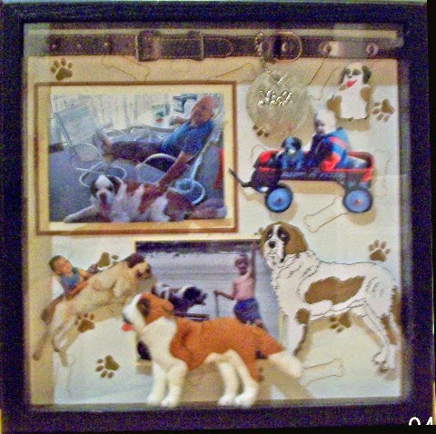 The collar is at the top of the page and has a tag with his name on it. She printed it out twice to piece it together to make it long enough. The metal tag was printed then embossed with the name. She attached the paper collar and metal bead chain with pop dots to bring depth inside the shadowbox.