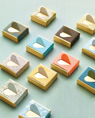 To make the packaging, cut scrapbooking paper into a 1 1/2-inch-by-6-inch strips. At the center of each, cut out a half heart using a craft knife (our online template makes this easy). Then, wrap around a stack of three chocolate tasting squares, secure with double-sided tape, and fold back the heart."