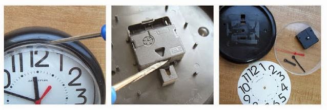 I found a website that shows just how easy it is to take a clock apart to change the inside face with paper. Just pop off the clear cover with a screwdriver near the tab that holds in in place. Then lift off the hands. Then on the back use a screwdriver to move the two tabs away from the mechanism to free it from the housing.