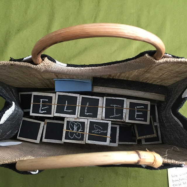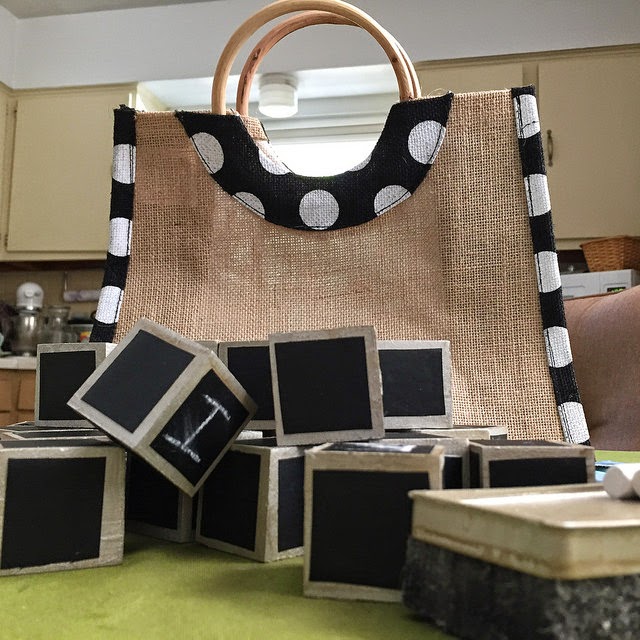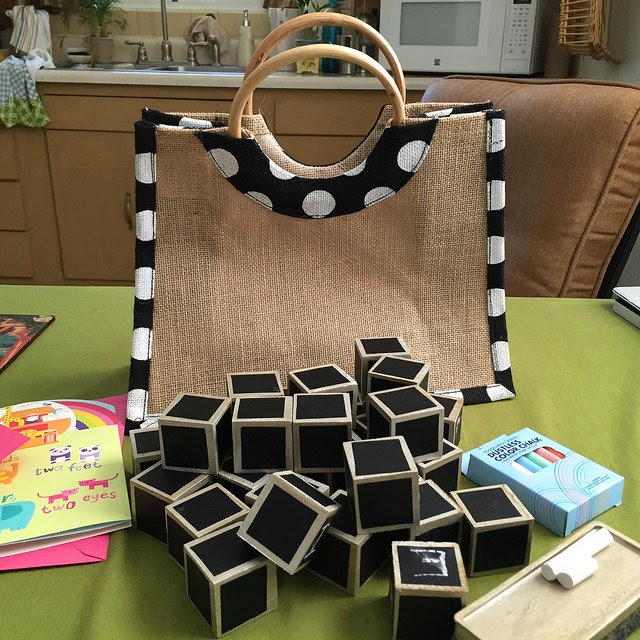 Along with a handwritten card to make it special. It says "We wanted to give you a handmade gift, so we painted these blocks for you & cut chalk vinyl for the sides. You can use them to learn your ABC's & 123"s and spell or draw & match blocks. When you get old, you can decorate your room with them & spell out (holiday) phrases or notes to surprise friends. Use the bag to carry them places for something to do when bored or to play with friends."
