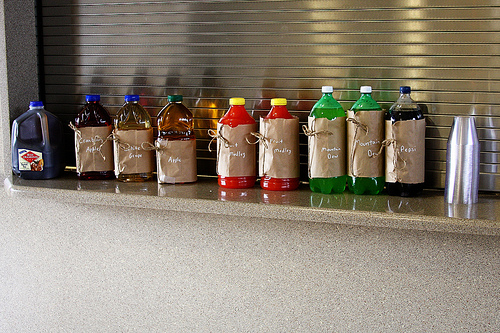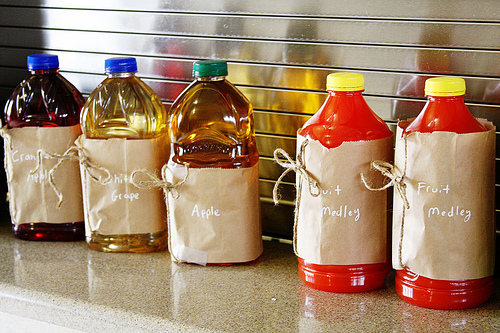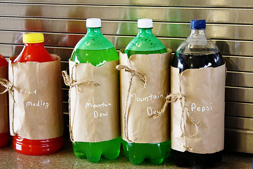 I merely took brown lunch bags and cut across the bottom of them, measuring the size of the area on the bottles of fruit juices and soda, and leaving a round, open piece of paper.