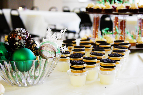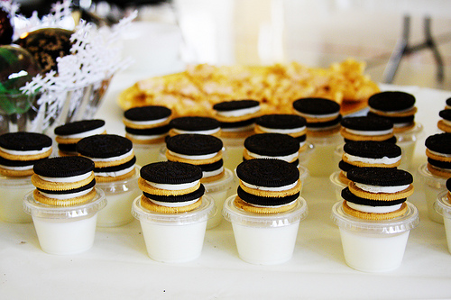 We simply filled the cups with milk and used the tops that came with the cups and put double stuffed Oreo cookies on top.