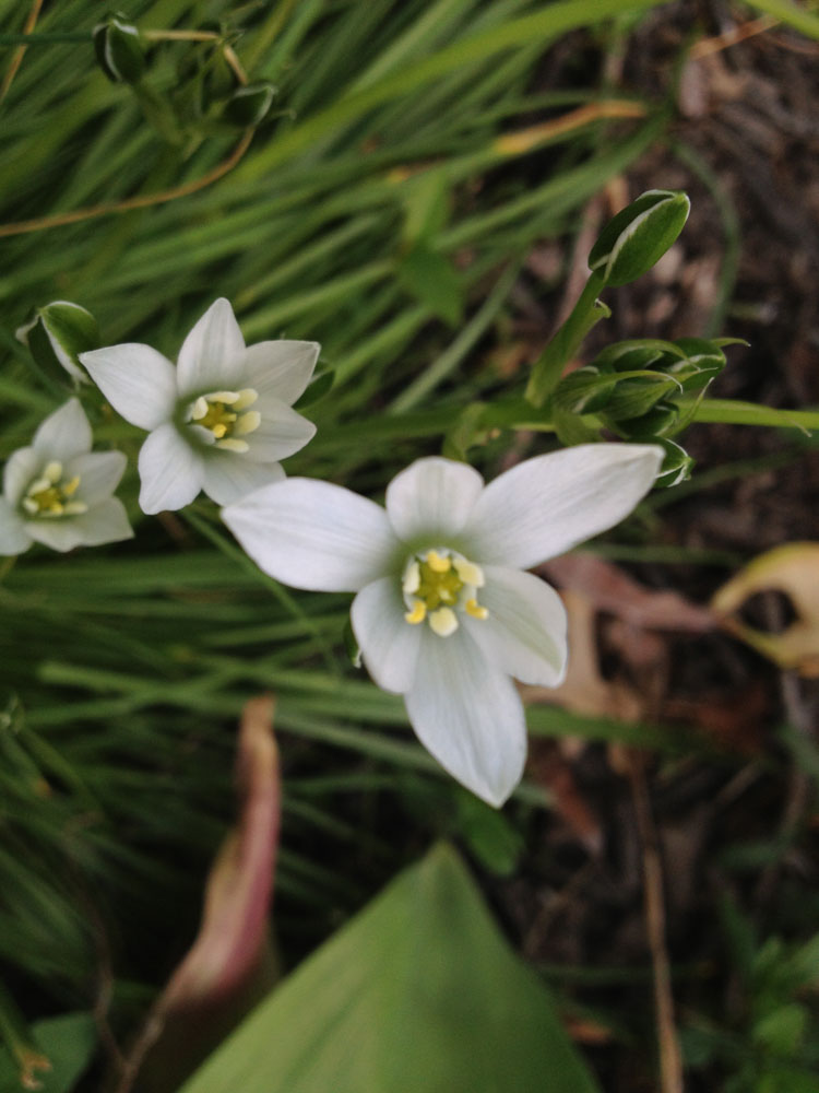 The Star-of-Bethlehem is a bulb. Just like the Tulip, there are three petals and three sepals, which together are called Tepals, that form a star shape because each are pointy. The flowers are a bright white with green lines underneath.