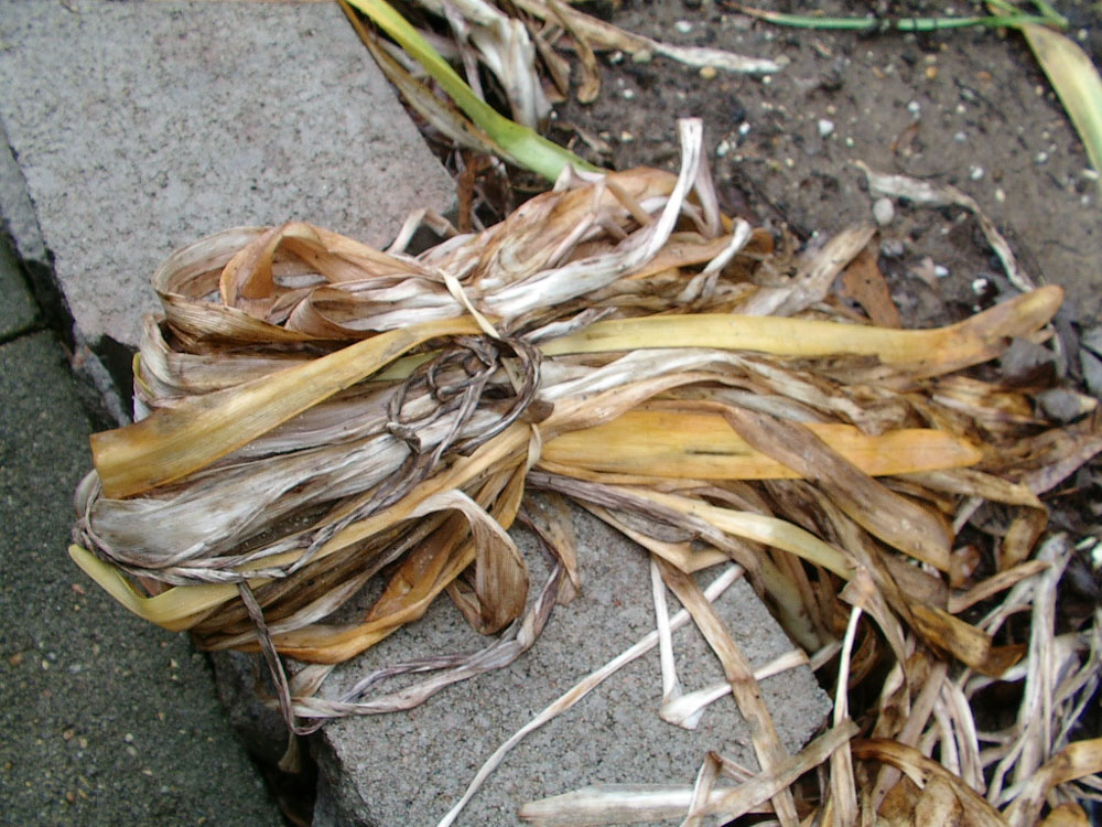 We have spread these all over our flower beds and then later dug them up as it is work to tie up the foliage with rubber bands or to maintain the foliage as it lays down taking up precious space in the flower beds. Then when it dies back, all that dead foliage is picked up and tossed or added to compost. This is why you often see this flower out in the middle or side of a yard in the grass. It is easiest to maintain when you do nothing with the leaves until they die back and then merely mulch mow them away.
