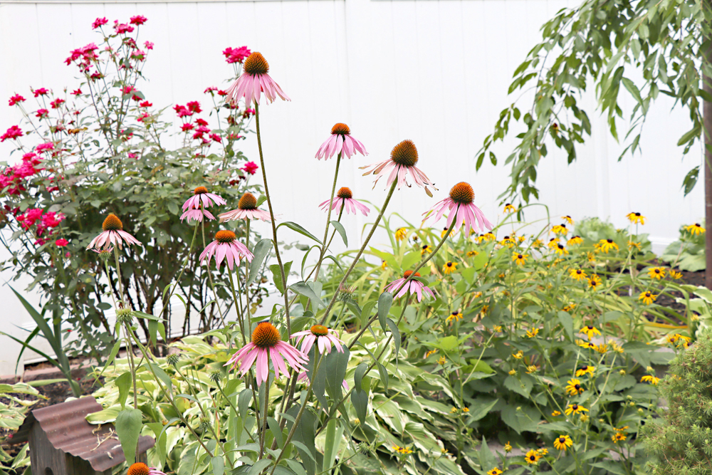 9. Echinacea purpurea Smbrero Tres Amigos - This was planted in 2024 in the side bed on the right and bloomed the same year. It has multiple colors!