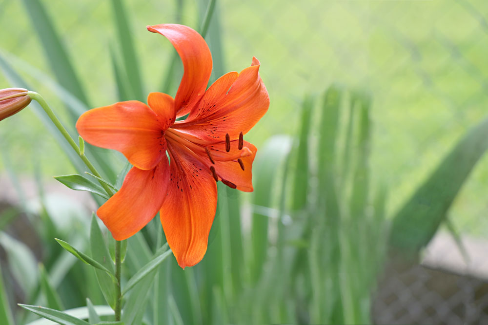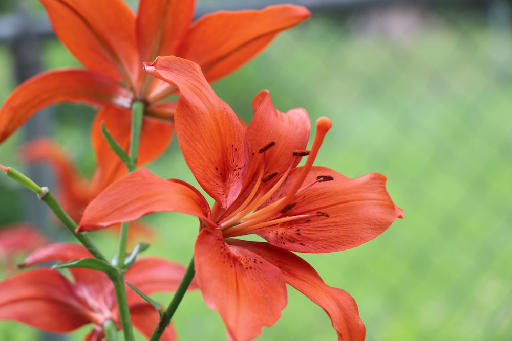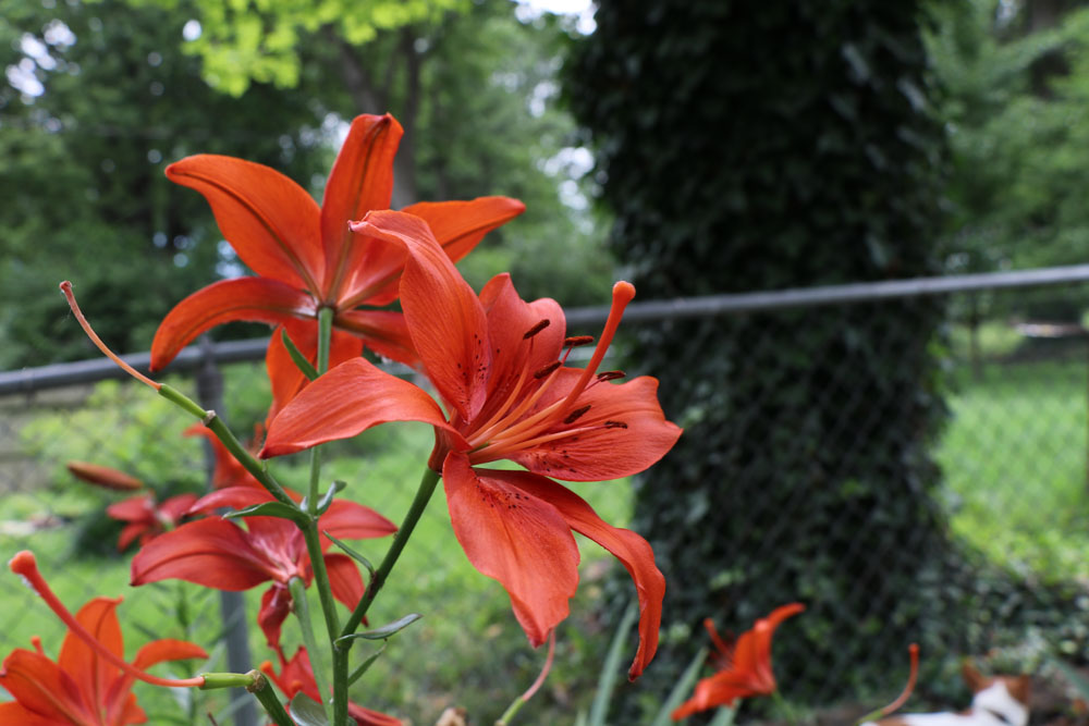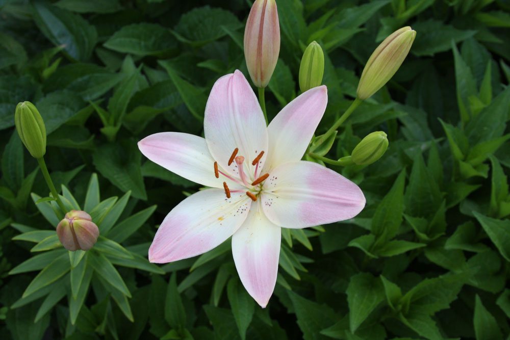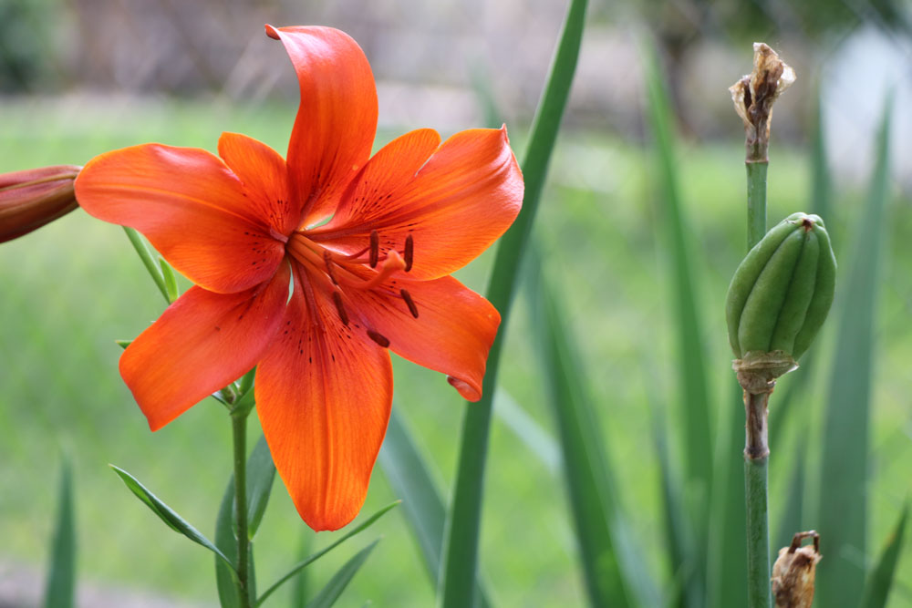 The Asiatic Lily has one strong tall stem and the flowers bloom out around the stem. That is, it has a spiral unbranched stem. The daylily has grass-like foliage.