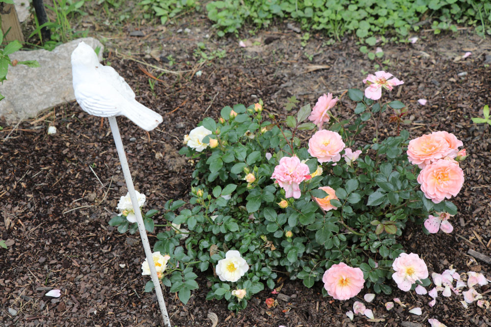 In 2024, I bought two more! That is how much I love these roses in the garden. They are so easy to care for. I took out an evergreen plant that I did not like trimming multiple times a year that brought me no joy. Since my Precious Moments statute was next to the 2019 rose set, I envision another set on the other side of the statute, and I just love it all together! The newest roses are Peach Drift 'Meiggili' (cuplike) and Pink Drift 'Meijocos' (semi-double). I spied them on the website when I studied these roses in 2023, so was prepared to buy the ones I wanted.