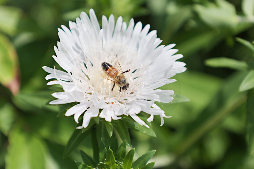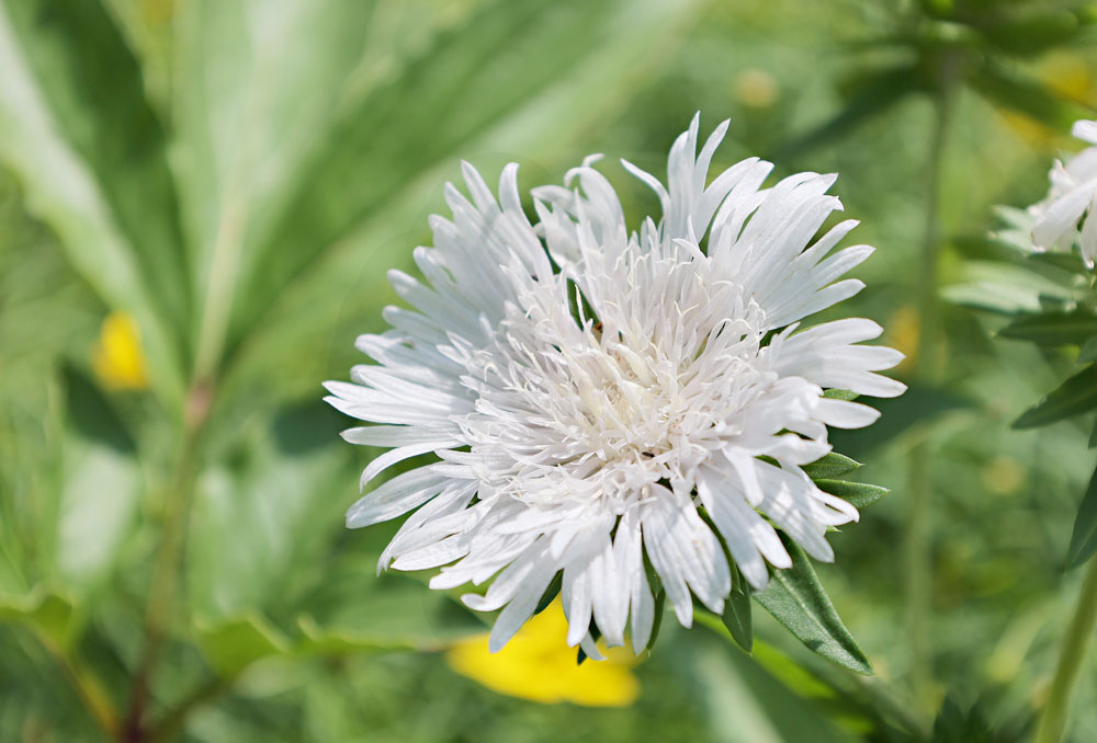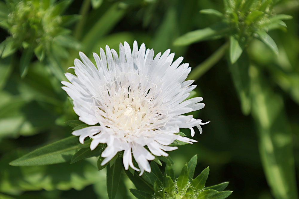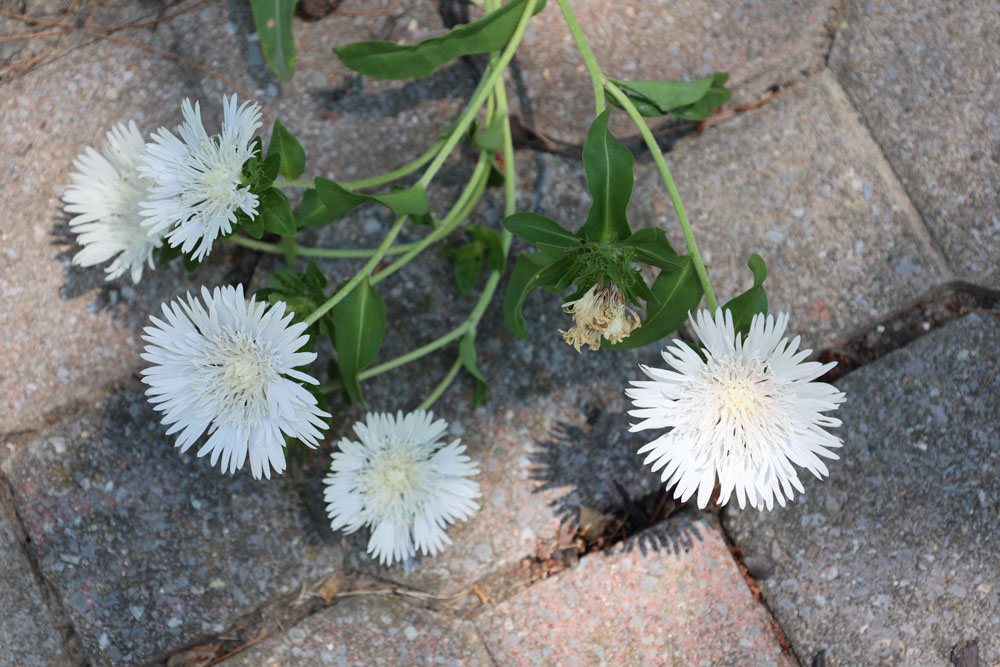 These blooms are white and for the longest time I could not remember the name of these flowers, so I always called them "the white flowers." The white flowers must be the "Divinity" cultivar as I see other Stoke's Asters are violet.