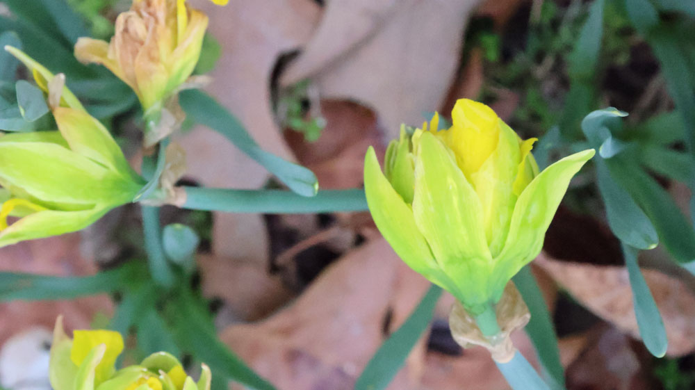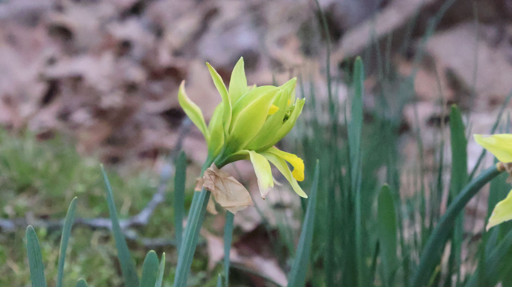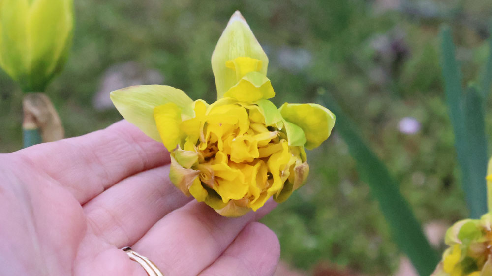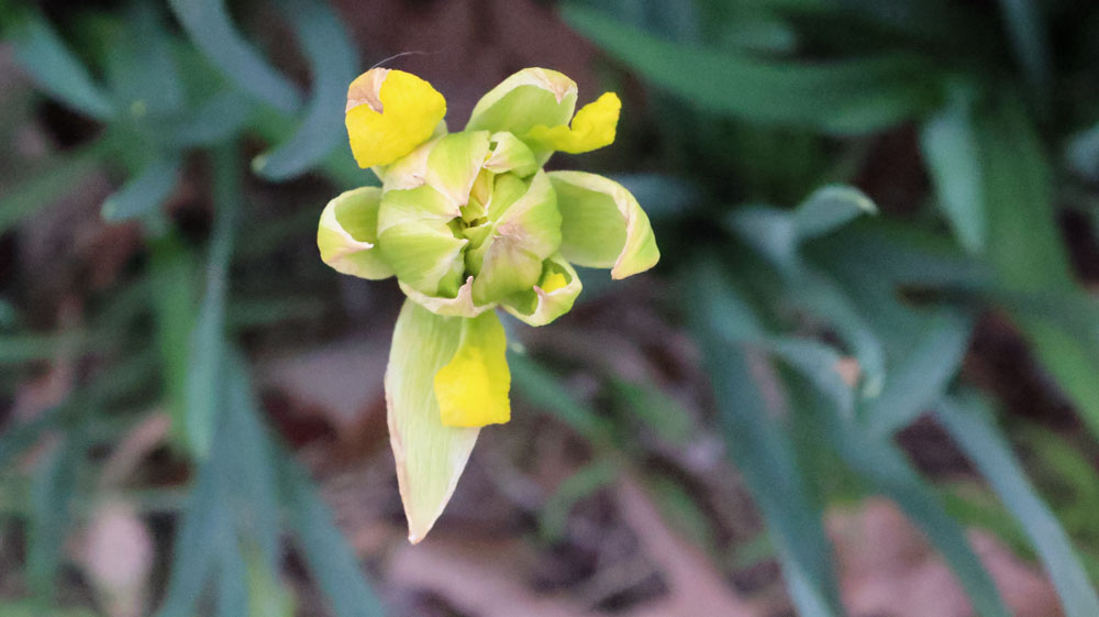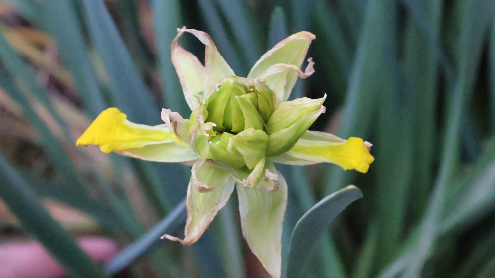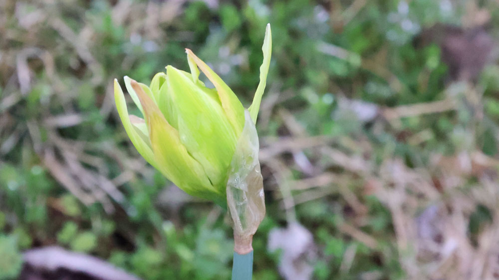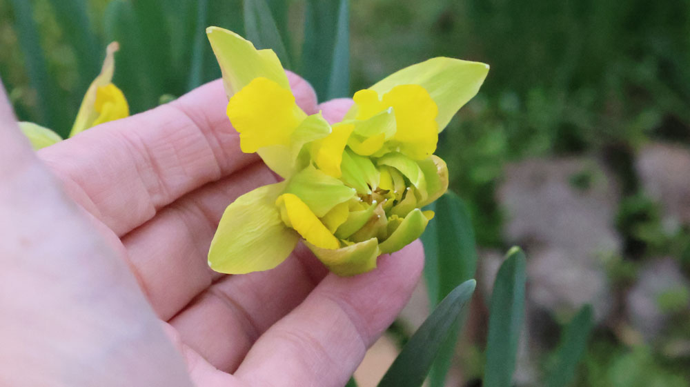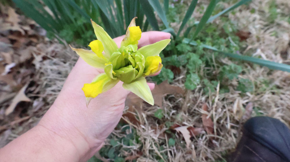 Van Sion Daffodil has yellow petals streaked with green, or in my case, it seems more green with bits of yellow! This daffodil is highly variable as no two are alike.