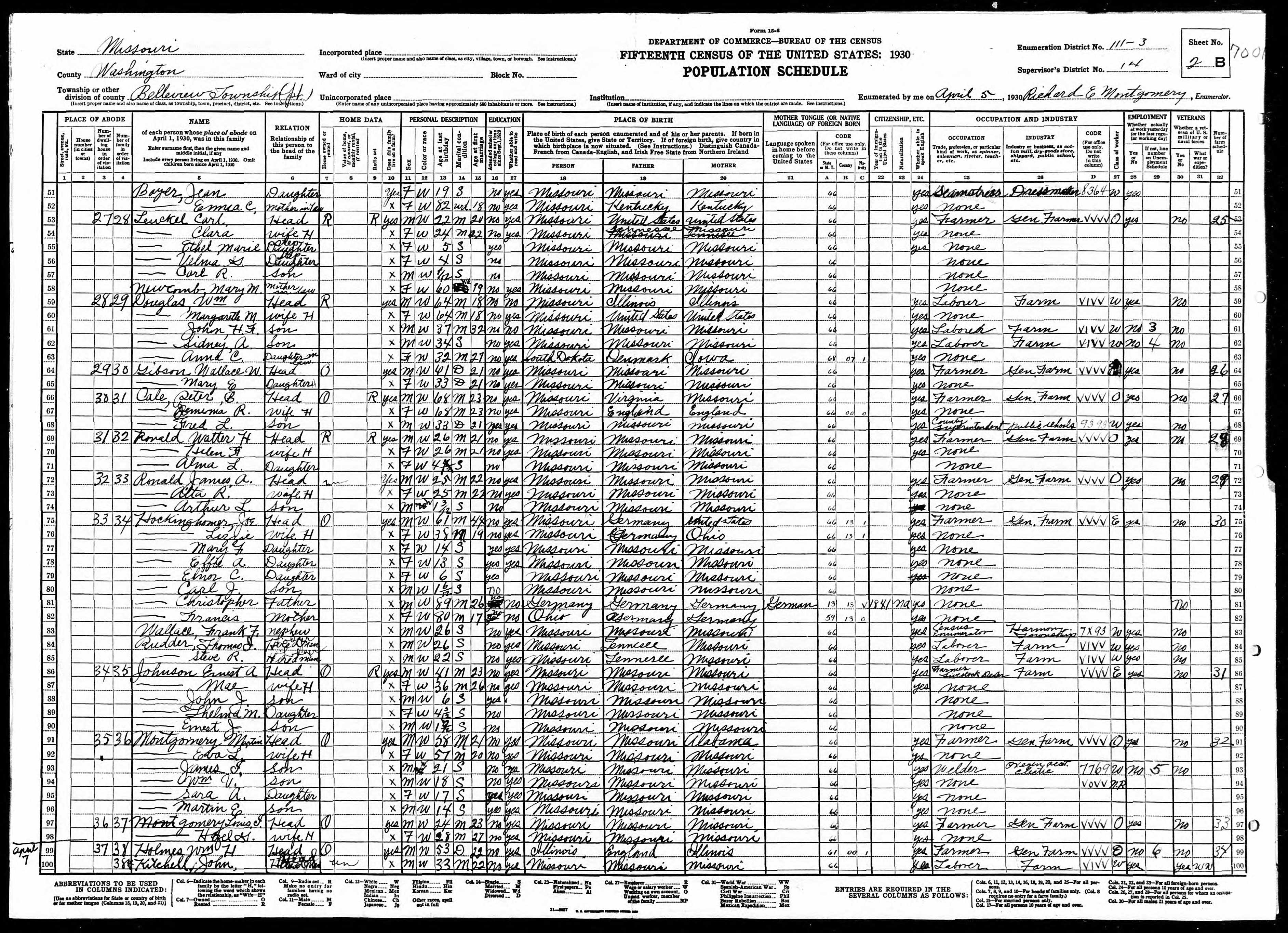 In the 1930 Census, Missouri, Washington, Belleview, District 0003, William (64) and Margarite (64) have moved back to Belleview from St. Louis and were 18 years old at the time of their marriage. Williams's father and mother are both born in Illinois and his occupation is laborer on a farm for wages. He is not a veteran. Also in the home are son John H. F. (37) who was 32 years old at the time of his first marriage and is also a laborer on the farm. Son Sidney A. (34) is single and a laborer at the farm. John had been unemployed 3 months and Sidney 4 months. Also in the home is daughter-in-law Anna C. (32) who is John's wife.