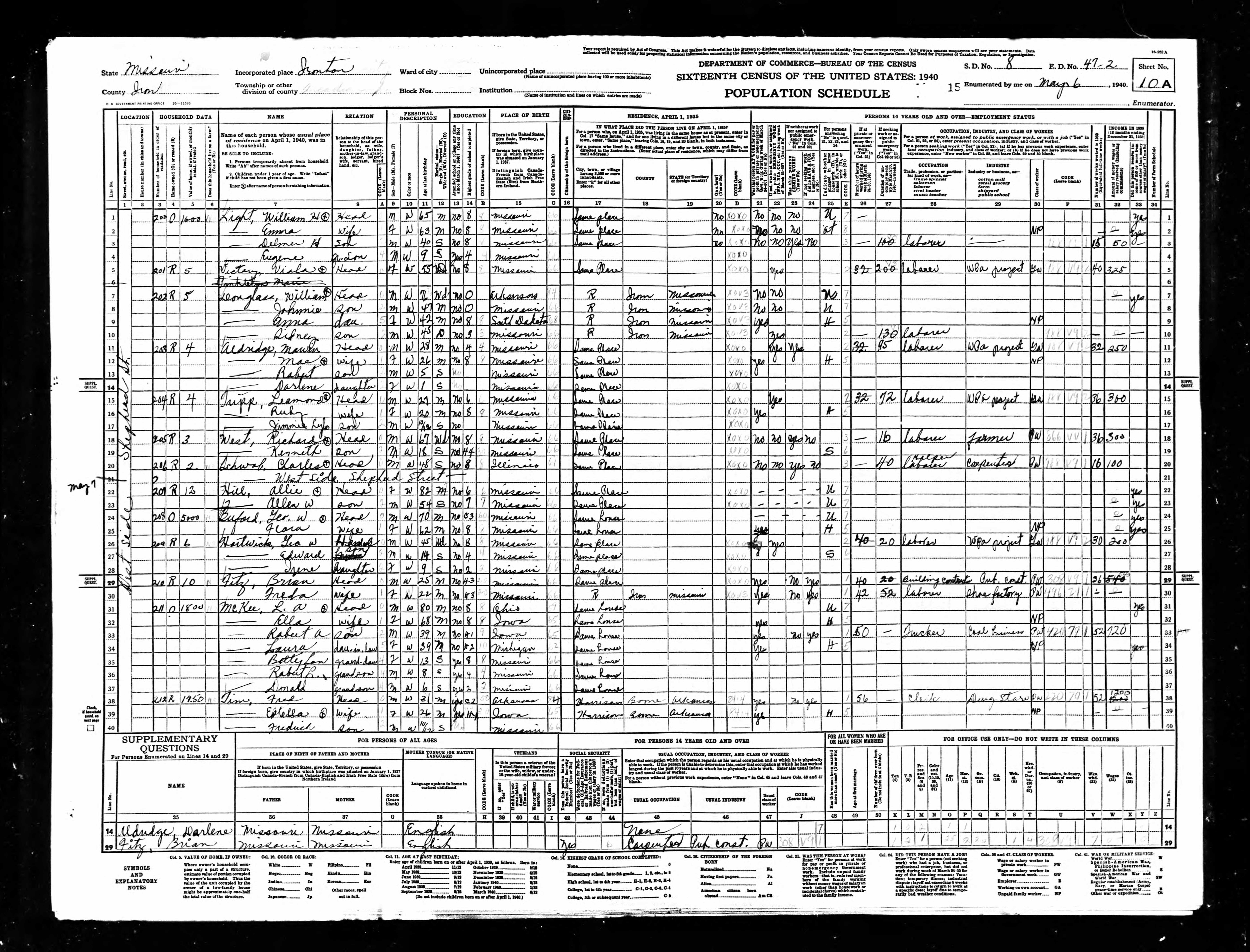 In the 1920 Census, Missouri, St Louis (Independent City), St Louis Ward 8, District 0147, William (54) is renting a home on South 8th Street in St. Louis (which is near Soulard Market), could not read or write, and is working as a laborer in the foundry industry. A foundry is a factory that produces metal castings. Williams father is born in North Carolina and his mother in Illinois. Margaret (54) could read and write. Children in the home are John (26), Leona (18), Theodore (16), Laury (11), Syndy (23), and a daughter-in-law Barbara (19). Barbara immigrated in 1910 from Germany and was naturalized in 1917. Leona was working labeling in a grocery store, Theodore was a laborer at the foundry, and Syndy was a trucker at the foundary.