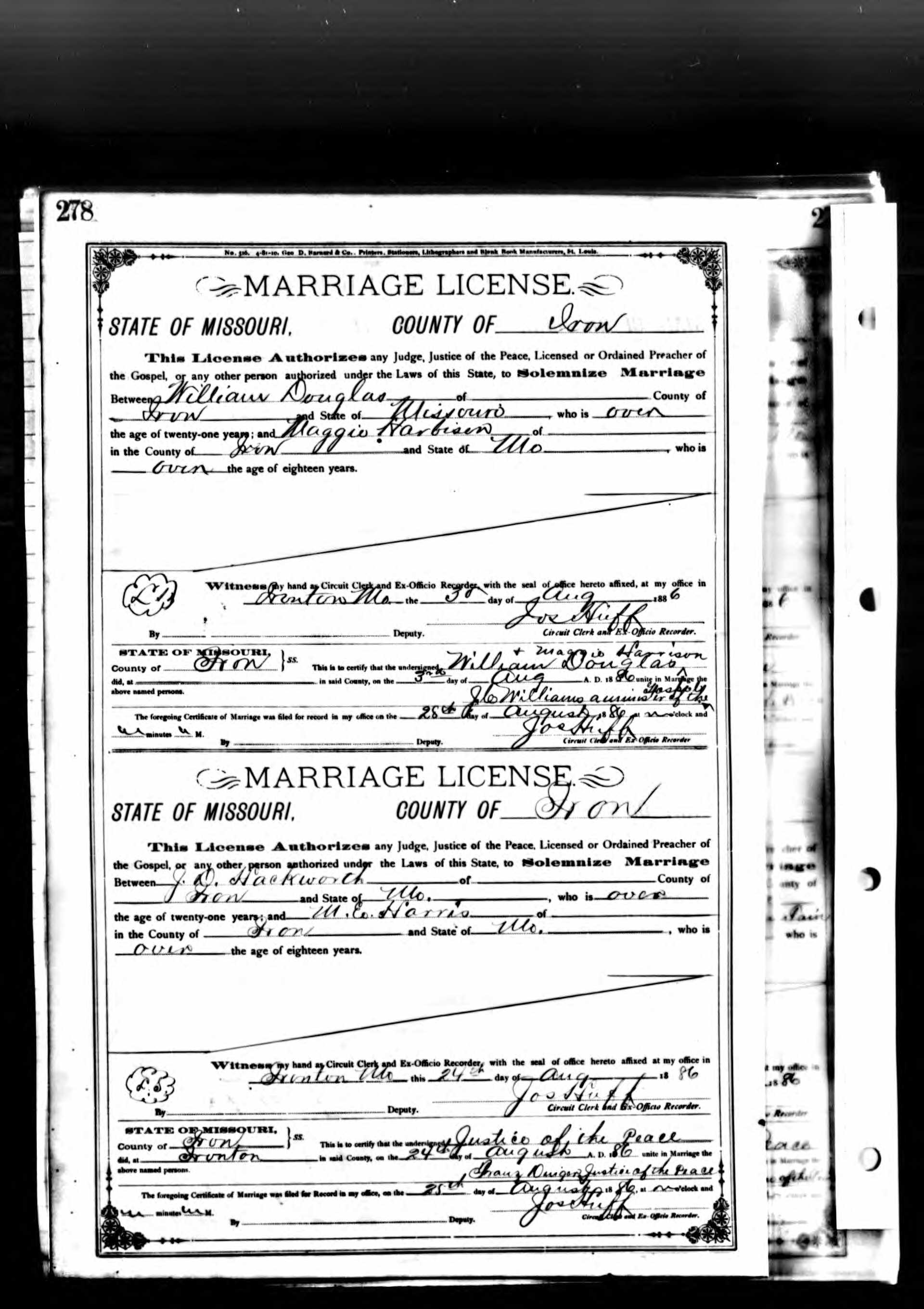 On June 14, 1889, William and Margaret have a daughter, Margaret Ellen May Douglas, born in Leeper, Missouri (What is source of location?)