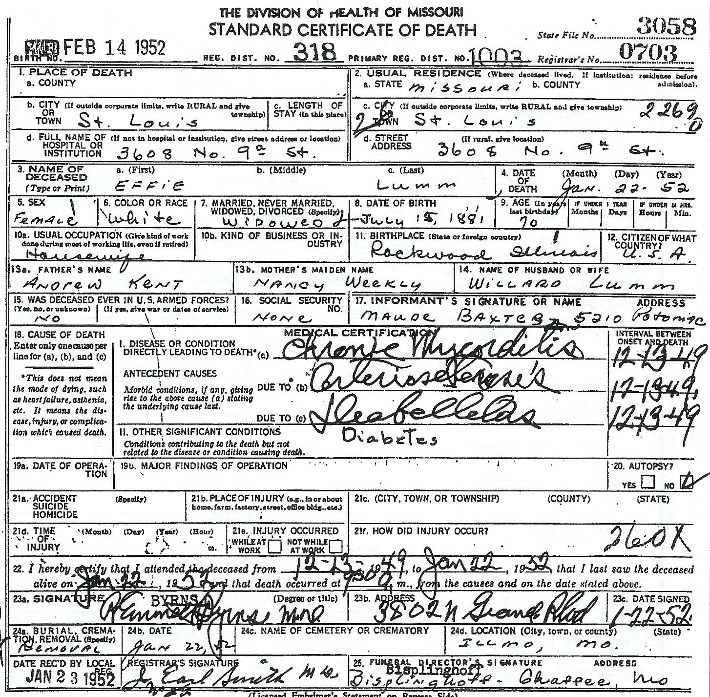 Andrew Davis Kent died on November 8, 1928, at 6 p.m., at the age of 68 years, 11 months, and 2 days. He was buried at Oakdale Cemetery in Commerce, Missouri, on November 9, 1928 (His daughter Effie (Kent) Lumm is also buried in this cemetery, having died January 22, 1952). His Death Certificate indicates that he is married (not widowed, but could be an error of past tense of "married."). His occupation was carpenter. The informant was his son, Date Kent. His father is listed as Thad Kent and his mother as Sarah Katherine. He died of chronic, acute colitis, which is an  inflammation of the inner lining of the colon. I believe it says ulcerative colitis. The doctor had first attended to him about May 1928.