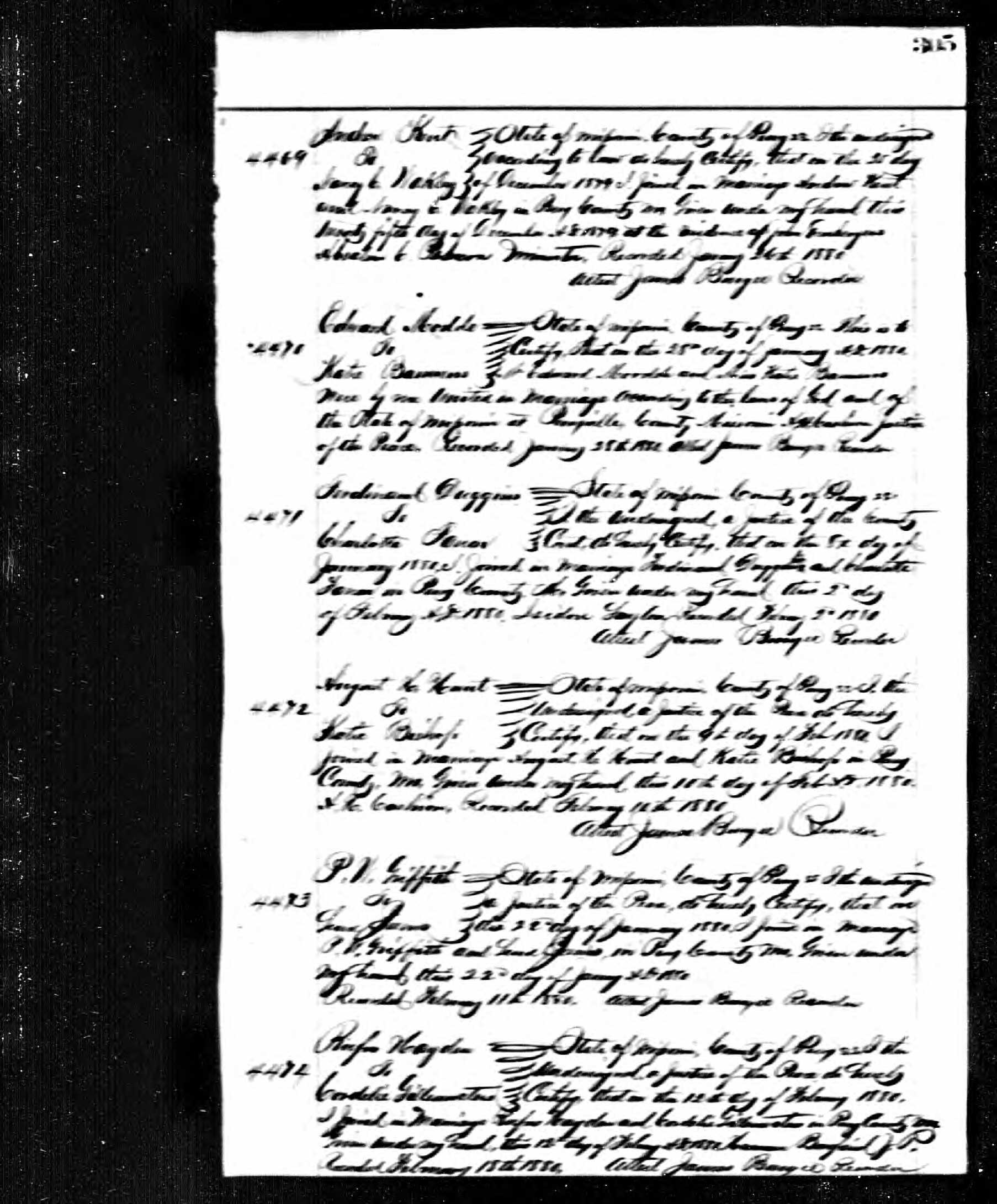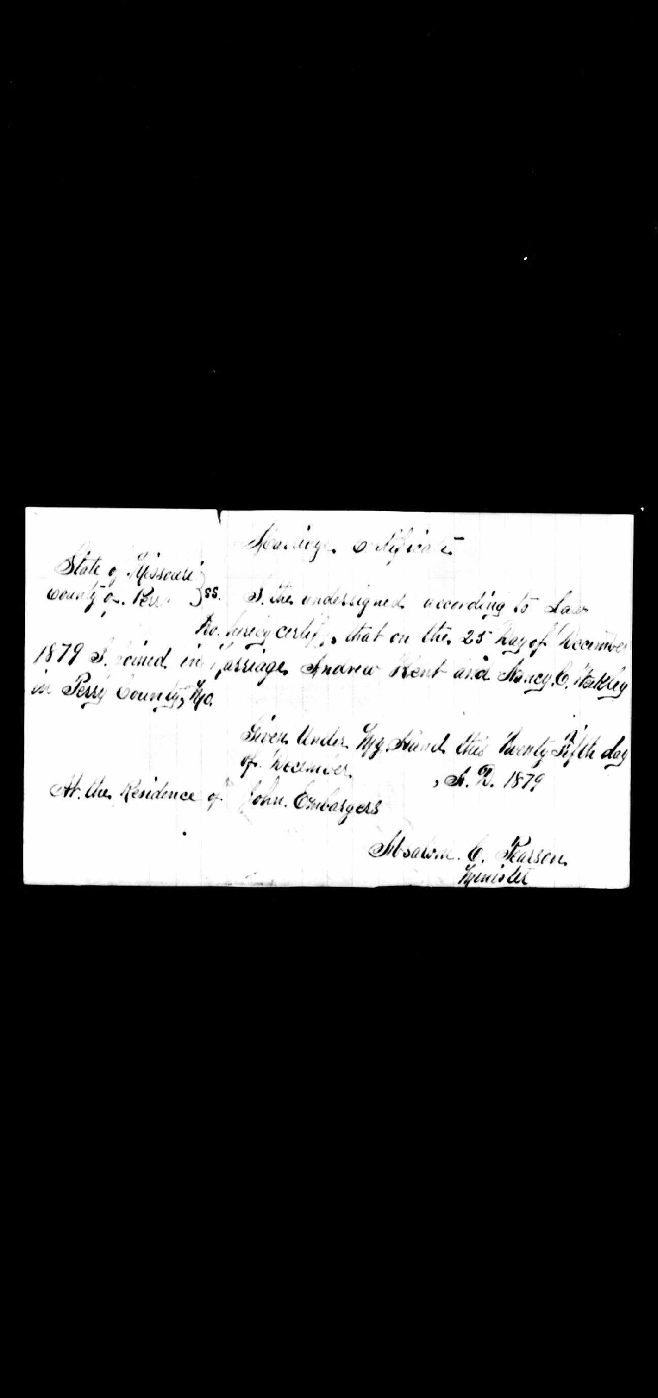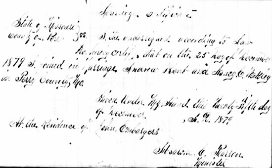 On Christmas day, December 15, 1879, Andrew and Nancy cross the Mississippi River to marry in Perry County at the residence of John Embergher (Marriage Record; Marriage Record 2). Sebastian E. Parson was the Minister. I have found John Embergher (40 from Baden Germany) living in Bois Brule in the 1870 census, which is just over the river from Chester, with his wife Sarah (30 from Arkansas). I wonder if he or his wife were related. In a quick research, I believe that his name changes to John Joseph Amberger and Sarah’s maiden name is Boshars. John and Sarah are married in Jackson County, Illinois, on February 11, 1864.