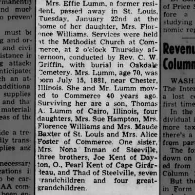 The Southeast Missourian, Cape Girardeau, Missouri, Friday, Nov. 9, 1928 page 1 Commerce--Funeral services for Andrew Kent, 69 years old, who died Wednesday evening at his home here, were held at 1:30 this afternoon at the home. Rev. Hall, pastor of the Methodist church, conducted the services. Interment was in a cemetery here. Kent was a retired farmer, and since the death of his wife some time ago, he had been living with his children at their homes here and in St. Louis. A number of sons and daughters survive. He suffered a stroke of paralysis 10 weeks ago in St. Louis and had been critically ill since that time.