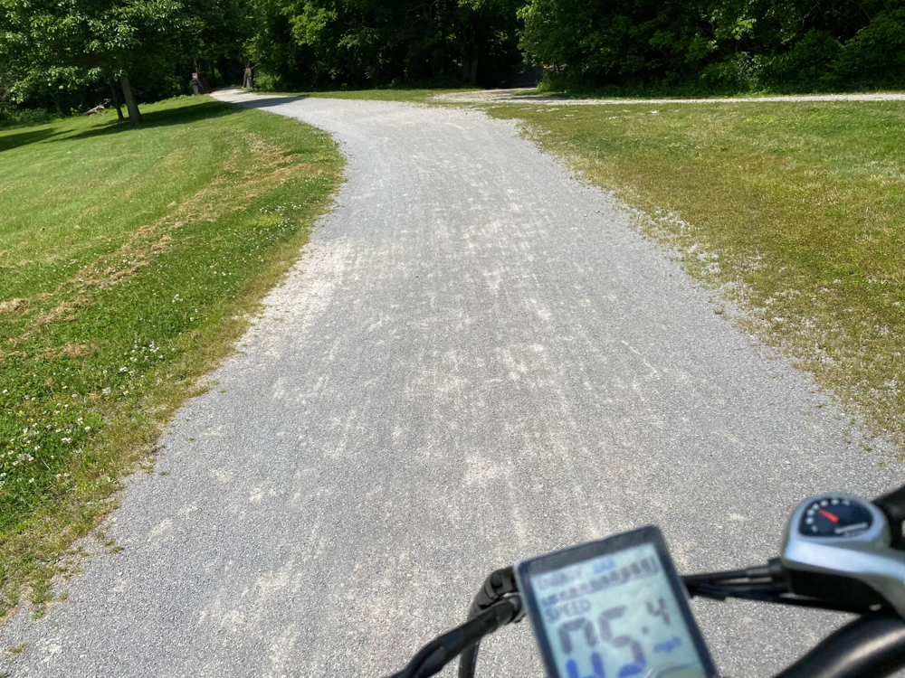 On the above bike ride, we went to Vienna and went south. We did not quiet make it all of the way to the end because we feared our bike's batteries would be too close to drained, so we turned around a at Belknep which was a round trip of 15.6 miles. We know we can go 20 miles on the batteries, but that was not quite enough to go the whole way, so we decided to turn around.