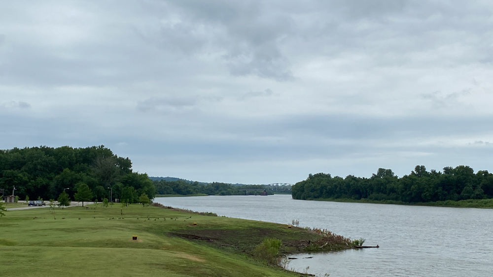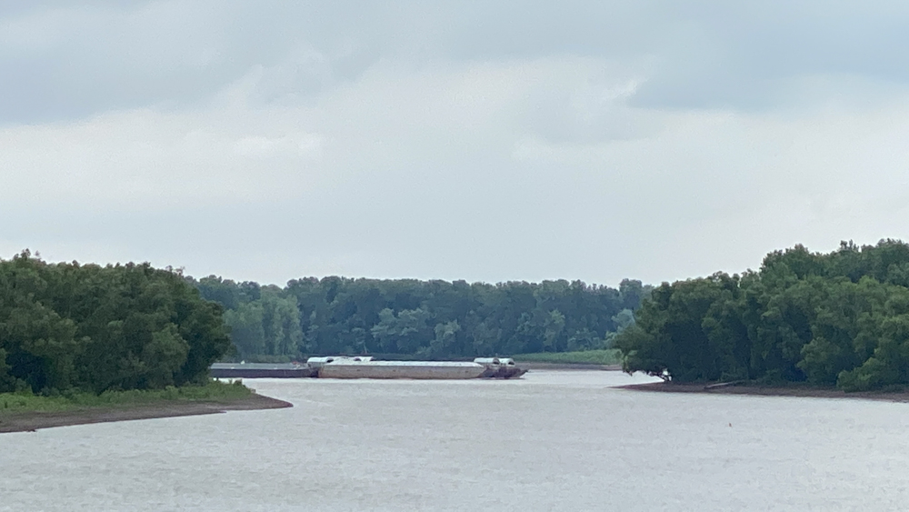 This is a shot down river that shows where the Kaskaskia and the Mississippi Rivers meet (the confluence). A barge is passing by on the Mississippi River.