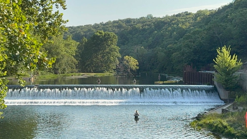 Here we are on that same bridge with the water flowing through it. I learned earlier this year that the fish are stunned when they go through spillways of a dam and that this is why the birds like to hang out there to catch their prey. It seems that people like to catch them that way too!