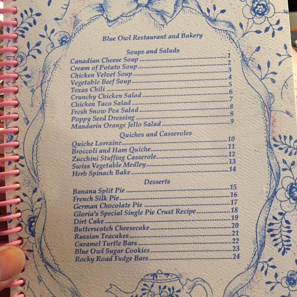The Blue Owl sells many recipe books of the things it makes for its restaurant and I photographed a few pages of the index.