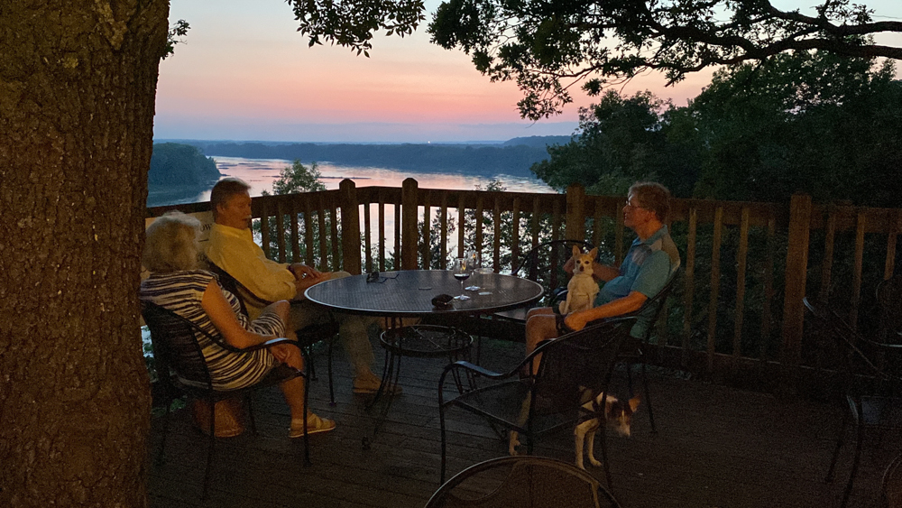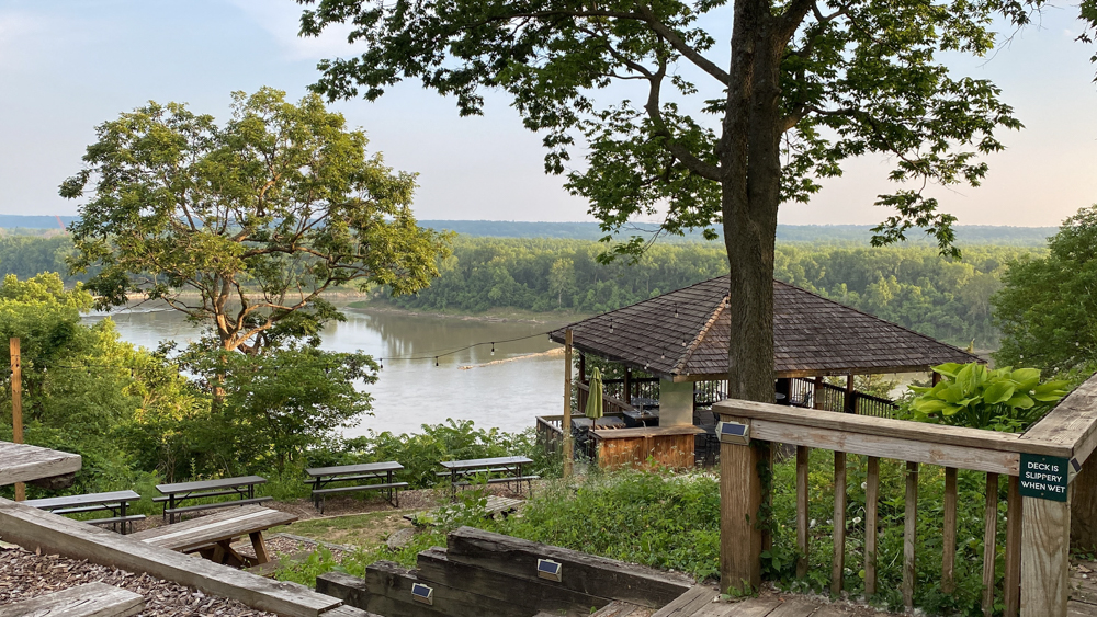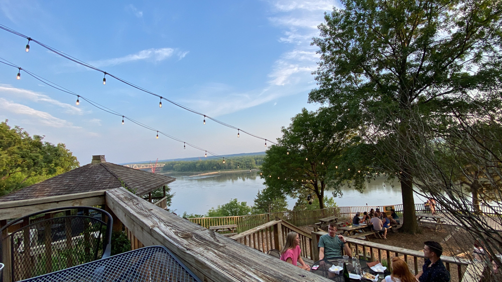 This place is just up the hill from Rocheport, Missouri, and in fact, you can see the trail leading up to this place in our video when we road the trailer earlier in the day on this page: Katy Trail State Park, Rocheport. You can park your bike at the bottom of the bluff and walk up for a break and some food in your biking experience.