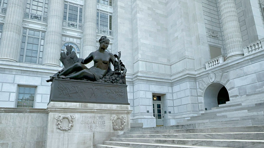 On top of the capital is Ceres, the Roman goddess of grain and agriculture and therefore selected as the patron goddess of Missouri, which is a strong agricultural state. Her left hand holds a sheaf of grain and she extends her right hand forward in perpetual blessing over the state.