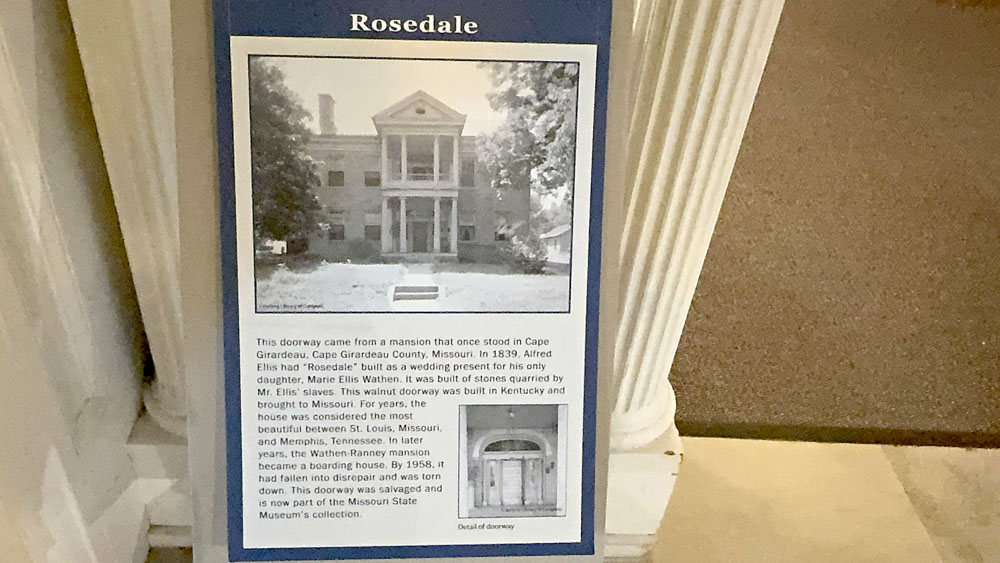 Being that we live in Cape Girardeau, I was surprised to see a doorway (I failed to get a photo but it is in the above video) of a mansion in Cape Girardeau called the Rosedale! "As early as 1839, one of the finest Georgian homes for many miles, the Ellis-Wathen-Ranney house, was erected on a tract of land that adjoined the James Reynold property on the south," which was located at 623 North Main. So the Rosedale was to the North of the Reynold's house (I think it was 501 North Main). The Ellis-Wathen-Ranney House was razed in 1958.