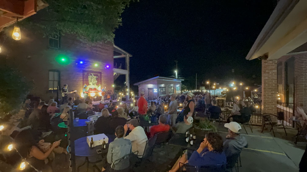 The business also runs 1837 Cellar Bar & Grill where we got a wine slushie that was free with our room and a little bit of food. There was music and a huge crowd of people. I get the feeling that the town of Hermann knows how to party. It was a nice crowd of people though. In this photo, people filled the alley all the way down to past the building in the back of the photo. We also took a walk down the street at night, but did not film it.
