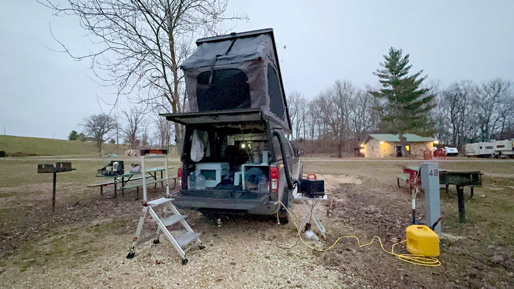 My truck is so dirty! We needed to stay somewhere with a power source for the diesel heater as we do not own a portable power source. We also used the electric for electric blankets to keep us warm.