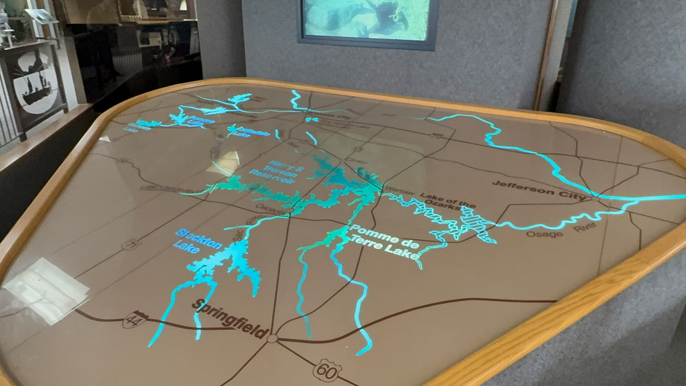 I learned so much from this presentation and map. I could have learned a lot more if I had time to stay and listen, but the dogs were with hubby in the hot day outside, so I was touring quickly. I could not believe how many man-made-by-a-dam lakes were in this part of Missouri and that they are all connected with the main purpose of keeping the Lake of the Ozarks from flooding.