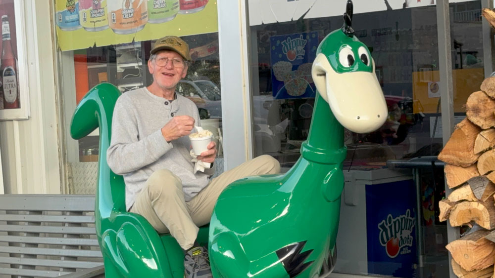 In Eminence hubby road Dino the Dinosaur while eating ice cream and someone decided to put a quarter in it to make it go.