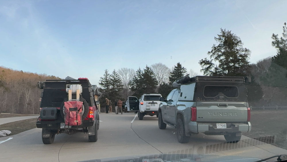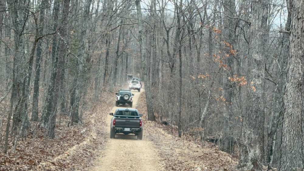 We went down this huge hill that was a steep grade full of gigantic ruts. I certainly had to be careful to avoid the ruts and go slowly. That was kind of wild! Jeremy Schumaker took this photo from the lead vehicle and my truck is there at the bottom of the photo with the white tent roof.