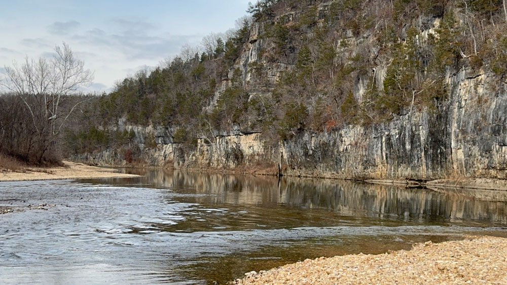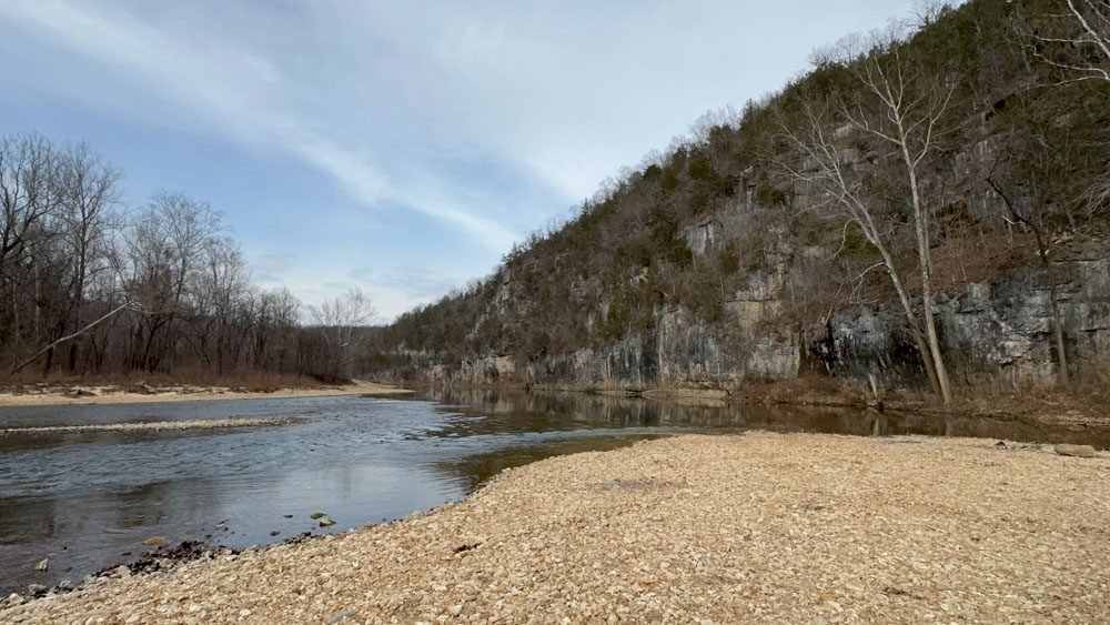 I have no idea where we were, but we stopped on this gravel bar with the large bluff and it was a beautiful scene. I believe this may be the Current River.