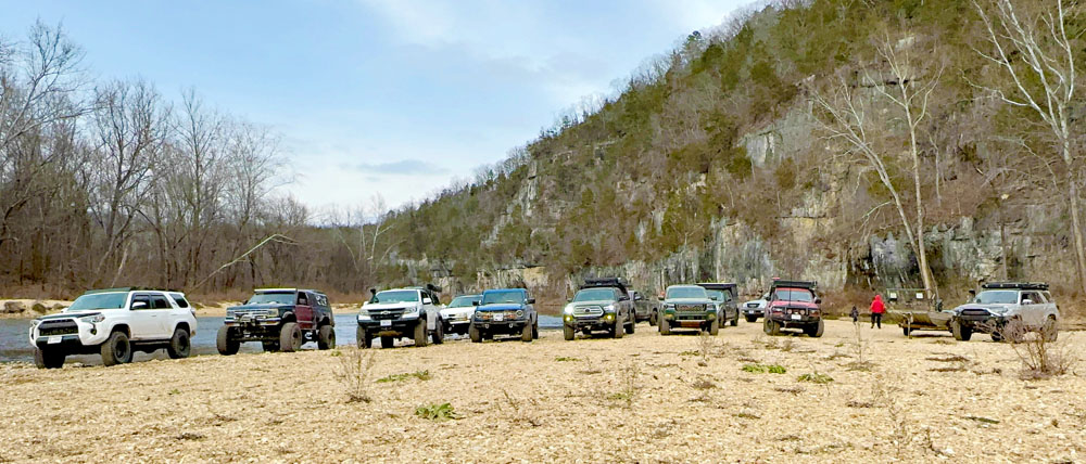 Then I did my first water crossing of the weekend! We crossed the Current River at Akers Ferry. Wow! That is a long way across! I knew they would winch me out if I got stuck. It was good to be with people I trusted. So I just went forward and kept my foot on the gas so as to not stop and keep the momentum going. That is my truck in front on this photo, and the line of vehicles following, but two had crossed in front of me.