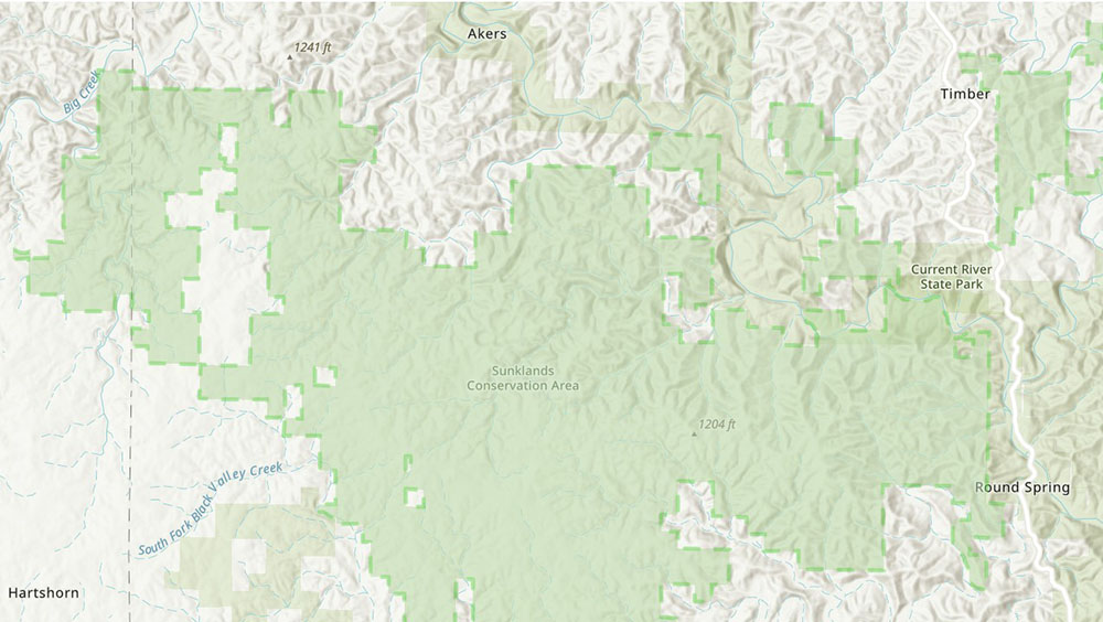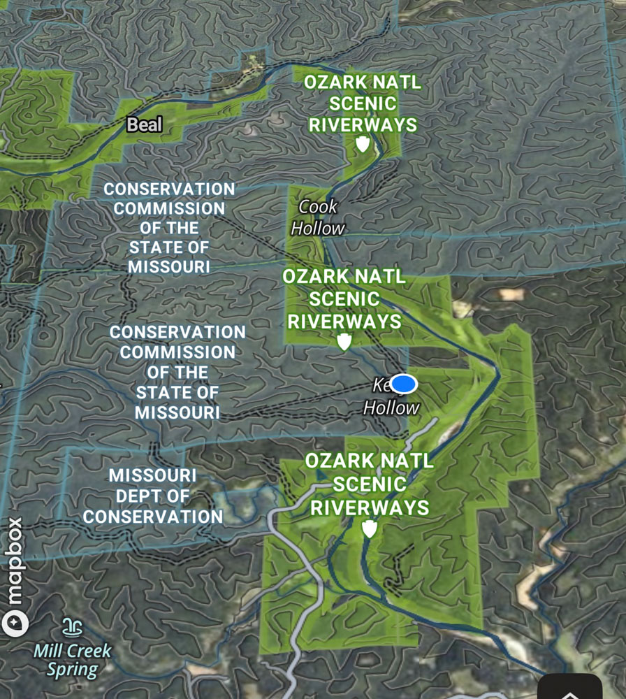 We ended up in downtown Eminence for a gas fill-up and then spent the night at Echo Bluff State Park. Echo Bluff is just above Round Spring on this map. The next day we left out of Echo Bluff and entered the Roger Prior Pioneer Backcountry which you can see on this map on the right. The map gives a good general idea of the amount of land we covered over the two days.