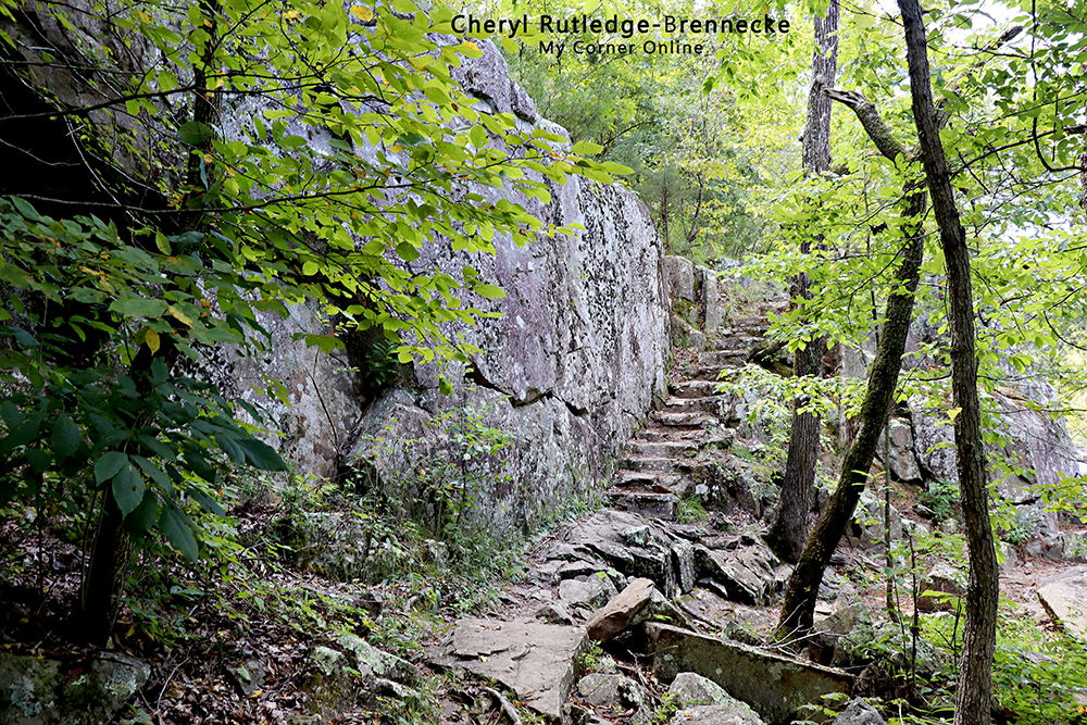 A man from St. Louis named Lon Sanders originally had a goal of turning this area into a private resort. His plans failed and the conservation area is named after him. There are many awesome feature remaining from his plans, including some hand-cut stone steps. As you walk around, you can imagine what his imagination for the place. There are also stone pillars with thick wire running through them as handrails or a safety guard.
