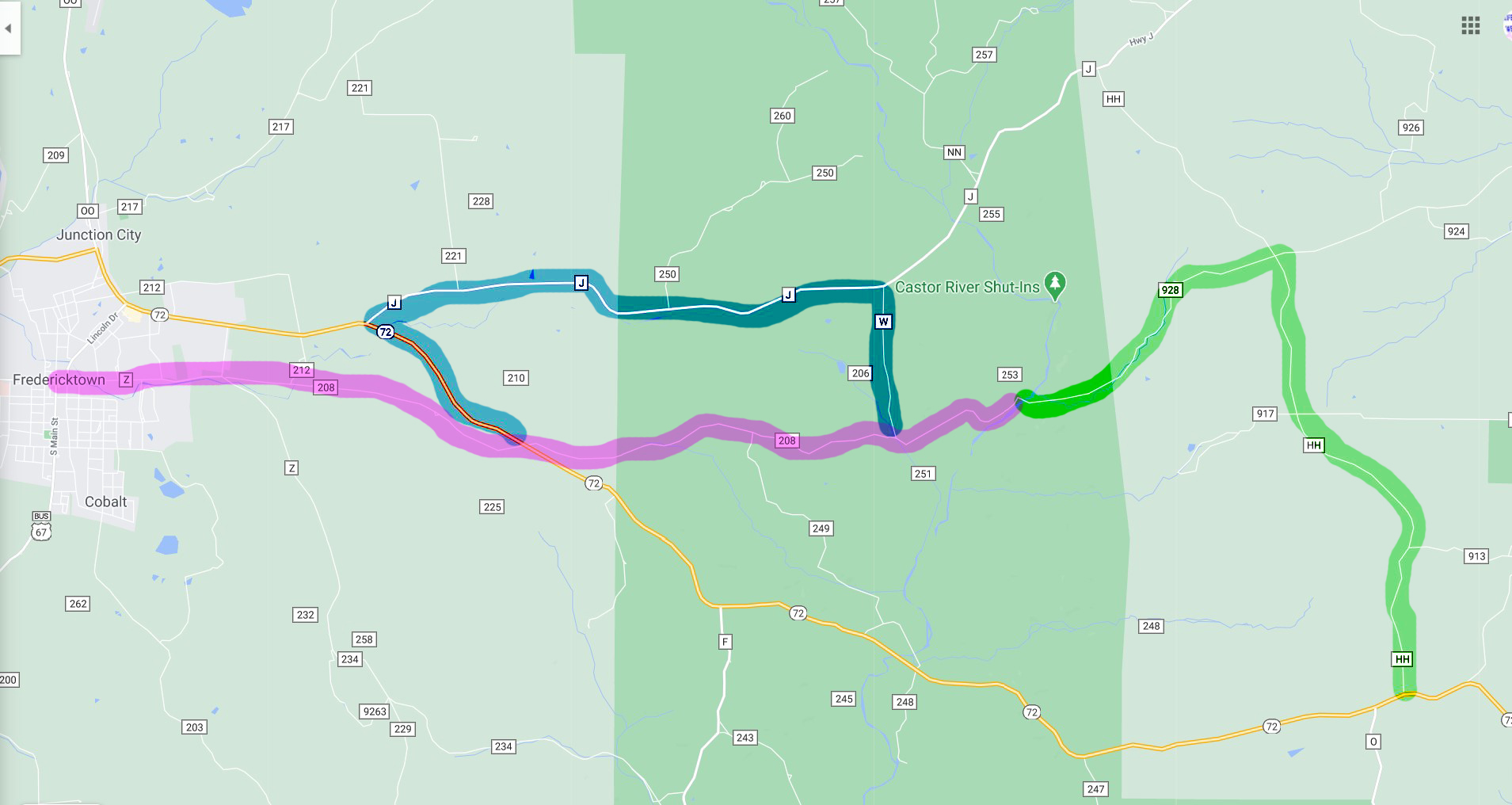 This is the helpful map that I created for those traveling because GPS will take you to the wrong place. Our GPS coming from Cape Girardeau took us up the green line on HH to 928. While we were there, some unfortunate folks from out of the area had also been taken to that location. There are several dips in the road covered by a stream of water on 928 which are intimidating, but in the end, you have to cross Castor River itself to get to Caster River Shut-ins. They were not able to do so in their vehicle (we did in our 4-wheel drive truck) and had to make the trip all the way back down HH to 72 and travel towards Fredericktown. What an ordeal they went through! So plan before you go! Look at the maps.
