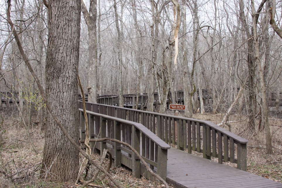 Behind the Visitor Center (which was closed when we were there), there is a .1 mile Overlook Trail that leads to a small pavilion with this grand view. It is worth the short hike. It is a vast view larger than a camera or video can capture. To the right side of the Visitor Center is the Bluff Trail which is a .14 mile hike straight down hill to the Swampwalk Nature Trail. Off the parking lot is the Hartz Pond Trail and we also walked down to the pond as can be seen in the video.
