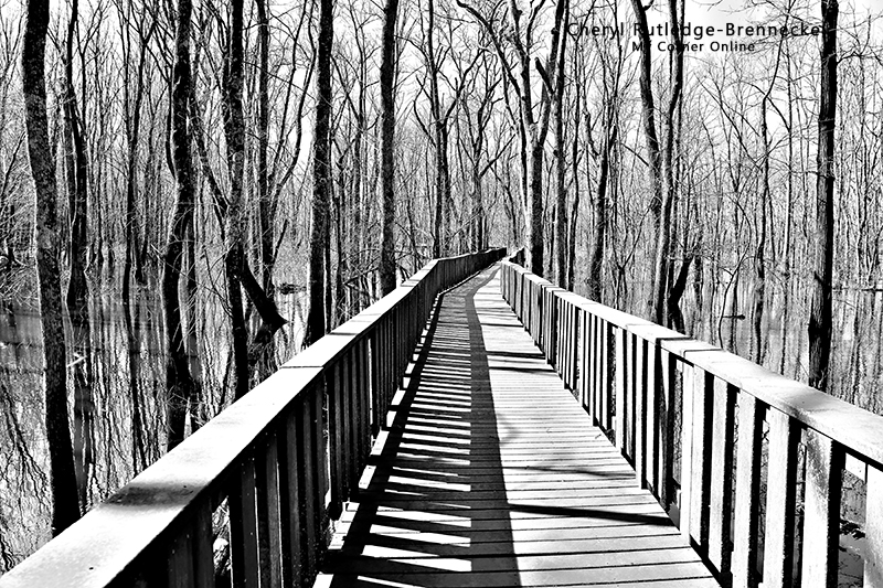 The boardwalk is always a great place to start at Mingo National Wildlife Refuge which is maintained by the U.S. Fish and Wildlife Service. I loved the shadows and lines as I walked the boardwalk and turned this photo into a high key black and white to draw out the shadows. The Refuge spreads out over two counties, Stoddard and Wayne. The visitor center is located 1 mile north of Puxico off Highway 51 at 24279 State Highway 51. The boardwalk often seen in photos is on the Swampwalk Nature Trail is located either a walk down a hill behind the visitor center, or a drive around to it. The Swampwalk Nature Trail is .8 mile loop. I would suggest having the map handy when you visit because the place is large and will take some time to just drive to all the places, as can be seen in the video above.