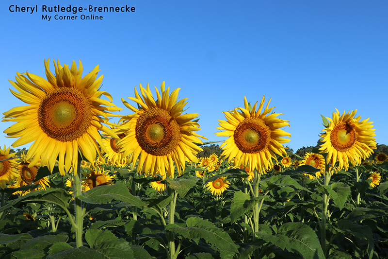 Sunflowers in a field are like marching soldiers all standing upright to attention and facing the same direction towards the sun.