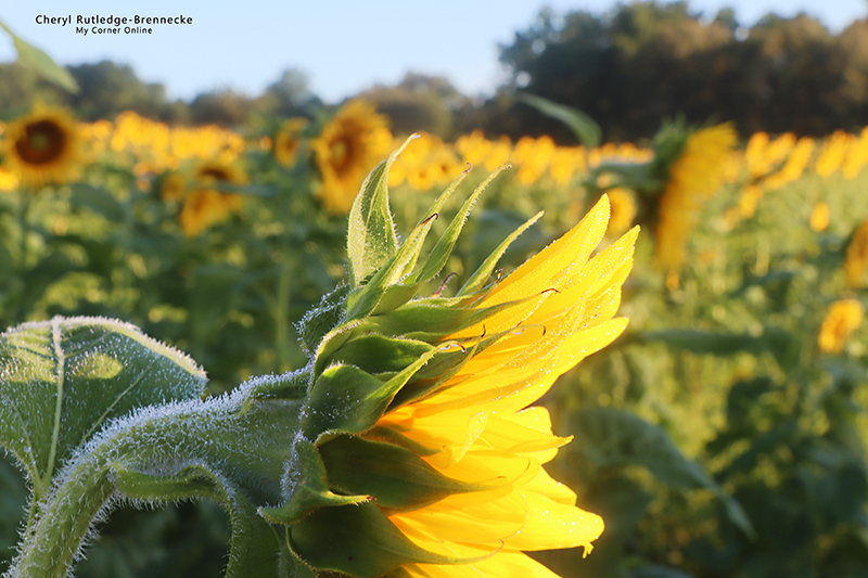 Back the beginning of the day, here is my first peak of the sunrise which was behind me as I faced the sunflowers. I was disappointed at first that I could not get this view with a sunflower in front of it.