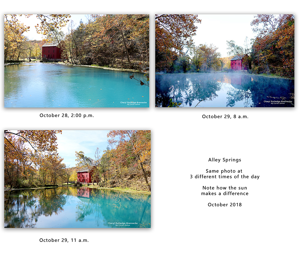 In the above video, I went to Alley Springs in Eminence three times: at 2 in the afternoon, at 8 in the morning, and at 11 in the morning, on October 27 and 28, 2018.