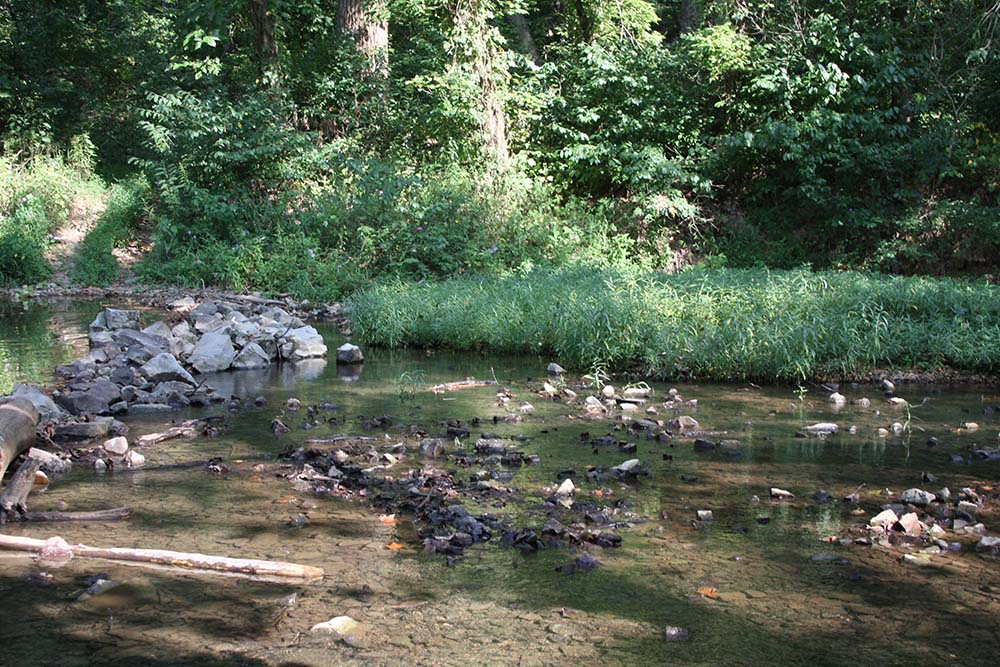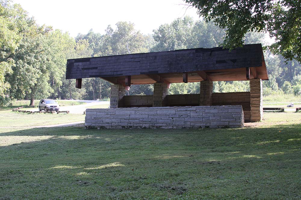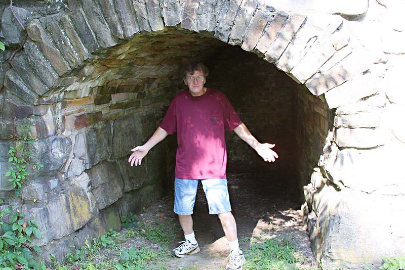 From Illinois Ozark: Nearby Big Creek was dammed and a millstream dug to the furnace to operate the bellows. Log homes and buildings were constructed and a whole town grew up around the furnace. Bridges were built across Hogthief and Big Creeks. When fully “blown in” and producing iron, the furnace consumed every half hour 37 bushels of charcoal, 750 pounds of iron ore, and 250 pounds of limestone. After 12 hours the furnace contained about 900 bushels of charcoal, 9 tons of iron ore and 3 tons of limestone. At this point the furnace was ready to be tapped. The molten iron flowed out of the bottom of the furnace onto a sand floor where, by a series of trenches in the sand, the iron was led into molds called pigs. After tapping, the hole was again plugged and another twelve-hour cycle began. The pig iron was loaded onto ox carts and transported to Elizabethtown where it was stacked on a levee west of where the Rose Hotel now stands. For miles around the furnace a roar or beat could be heard. At night a great shower of sparks and flames licked the darkened sky, and the burning hardwood in the charcoal pits made an aromatic smell pervade the valley. The furnace changed hands in 1844. By 1846 Illinois Furnace, Illinois had its own post office. The furnace was “blown out” and ceased operations October 8, 1850. Under new ownership in 1856, the furnace was enlarged and rebuilt to operate by hot or cold blast. The furnace again produced pig iron until sometime in 1861. During the war years of 1861 to 1865 there was a desperate need for iron. Records from the time do not show a furnace in operation in Illinois during the period. It wasn’t until 1879, again under different ownership, that iron was produced at the furnace. By this time all the timber conveniently located near the furnace had been used up. The furnace instead used coke, partially burned coal, to fire the furnace. It was barged to Elizabethtown then stockpiled at the furnace for use. The last iron from Illinois Furnace was produced the summer of 1880. The iron in Hardin County wasn’t of a sufficient grade to make iron works profitable in the area. Today the Iron Furnace is preserved as a United States Forest Service site. You can walk along the grounds and see the reconstructed furnace. No trace of the small village remains.