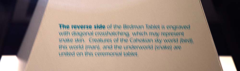 This sign says "The reverse side of the Birdman Tablet is engraved with diagonal crosshatching, which may represent snake skin. Creatures of the Cahokian sky world (bird), this world (man), and the underworld (snake) are united on this ceremonial tablet.