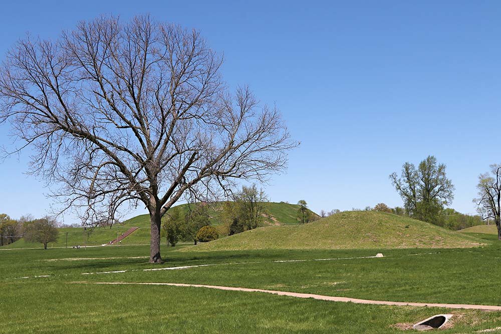 You could spend a long time reading in the museum. Then you take a trip outside and walk the paths to see a variety of mounds of varying types. That is Monks Mound in the distance with other mounds nearby.