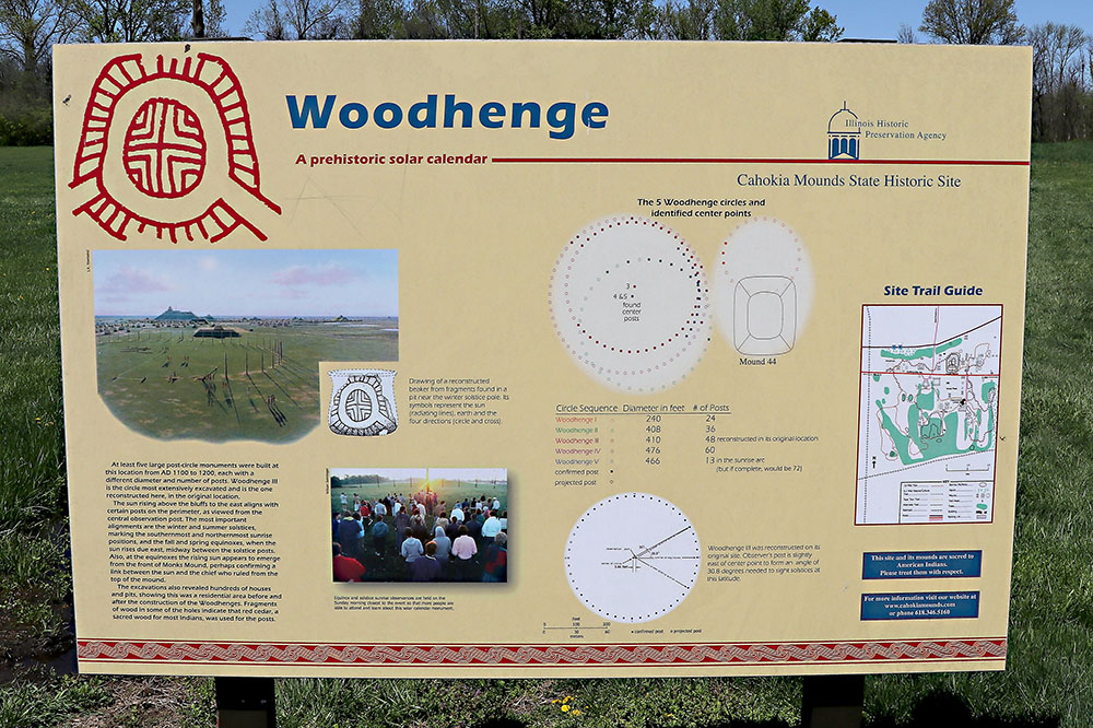 Monks Mound is the largest earthen monument in the Americas. If only we could go back in time to unravel the mysteries of this place. Over 12,000 years ago people moved into the area. Mississippians built the mounds. They grew squash, corn, sunflowers, and other crops. Corn (maize) grew well here and they had surplus. Great numbers could live here, up to 20,000 inhabitants. This meant some people did not have to farm and could specialize in other areas to form a whole society. They traded goods all across America. There are different types of mounds for different purposes. Flat topped mounds were where temples or other buildings were erected. Rich top mounds marking boundaries. Conical burial mounds. One mound greater than all the others was at the center of the community. This was the home of the chief. His wealth was immeasurable and his authority unquestionable. Service rendered to the chief was as service rendered to the gods. The people dug the earth and carried it on their backs up the hill to build it bigger and bigger. The baskets were 50 to 60 lbs each. 15 million trips over a 3 year period. Where the Mississippi and Missouri converged, it formed the lush American Bottoms. Other villages formed, such as St. Louis, in this area. Small houses were built as far as the eye could see in Cahokia. It was the city of power, vitality, wealth and security and prevailed for several hundred years. Cahokia was divided into areas for different purposes and there were miles of stockade walls for protection. There was a unique sun calendar that we call woodhenge. What contributed to the decline in the late 1200's or early 1300's? No one knows. Disease? Changes in climate? Declining resources? Conflicts from the outside?