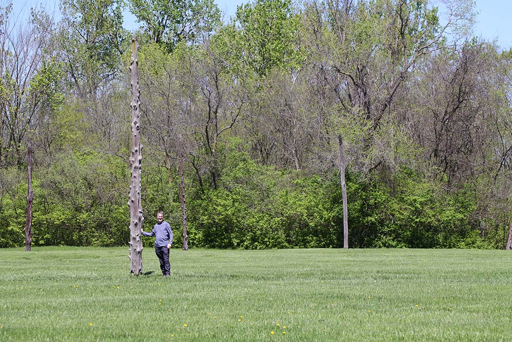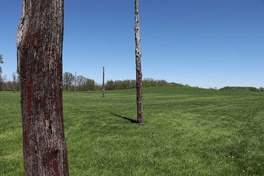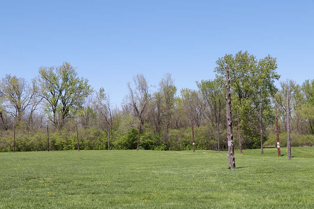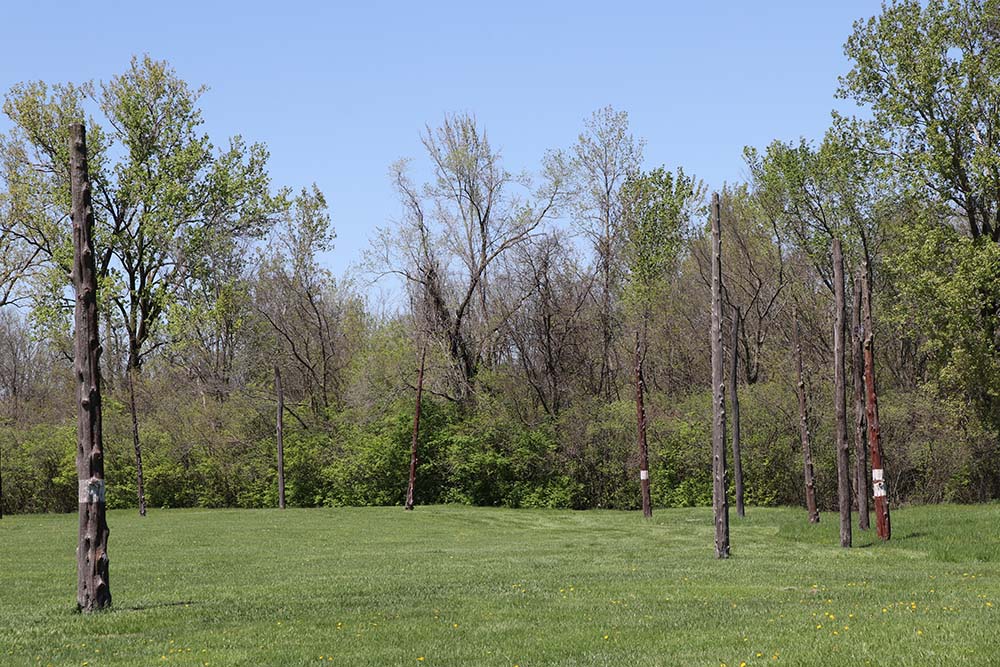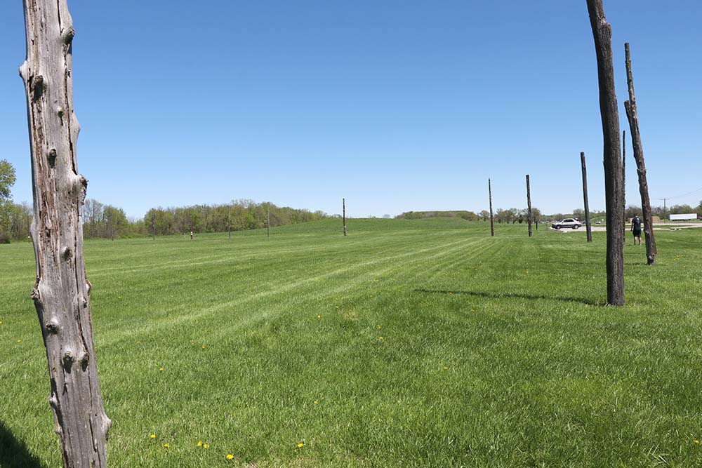 This sign says: The central ceremonial precinct of Cahokia was enclosed by a defensive wall, the Stockade (or Palisade). It was built of upright logs placed in 4-5 foot deep trenches and probably stood 10-15 feet high above the ground. It would take an estimated 15,000 - 20,000 logs to build this wall that was nearly two miles long. At regular intervals (about 85 feet, center-to-center) were bastions, guard towers with raised platforms for warriors to protect the front of the wall. L-shaped entryways were occasionally placed between bastions. The Stockade would also serve a social function. The wall enclosed an area of nearly 200 acres, including Monks Mound and 17 other mounds. Those living inside the sacred precinct were somehow different from those living outside, possibly related to the ruling elite. However, it is likely that all citizens would be allowed inside for festivals and ceremonies, or to help defend, if needed. It is not know if the enemy were local or from distant areas, or if the site was ever attacked. The wood does not survive, but archaeologists can see dark linear stains in the soil marking where the trenches had been dug into the lighter subsoils. Four constructions of wall are evident, often overlapping each other, with the size and shape of the bastions changing each time.