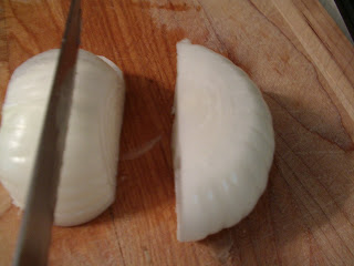 Cutting the onions up went fairly quickly. I cut the onion in half, then turned each half up on its side to cut slices. The half slices fell apart from each other fairly easily with the spatula in the pan.
